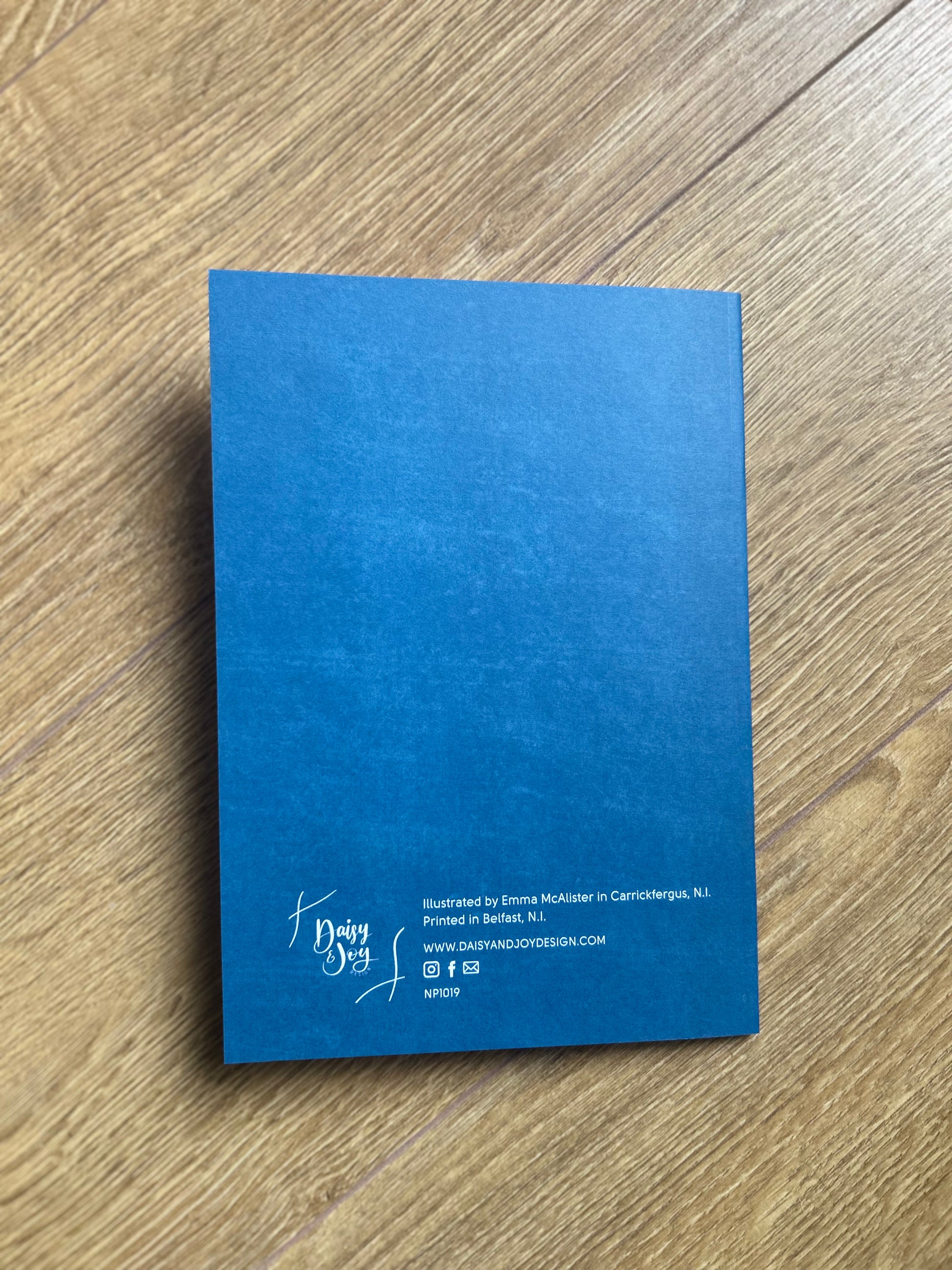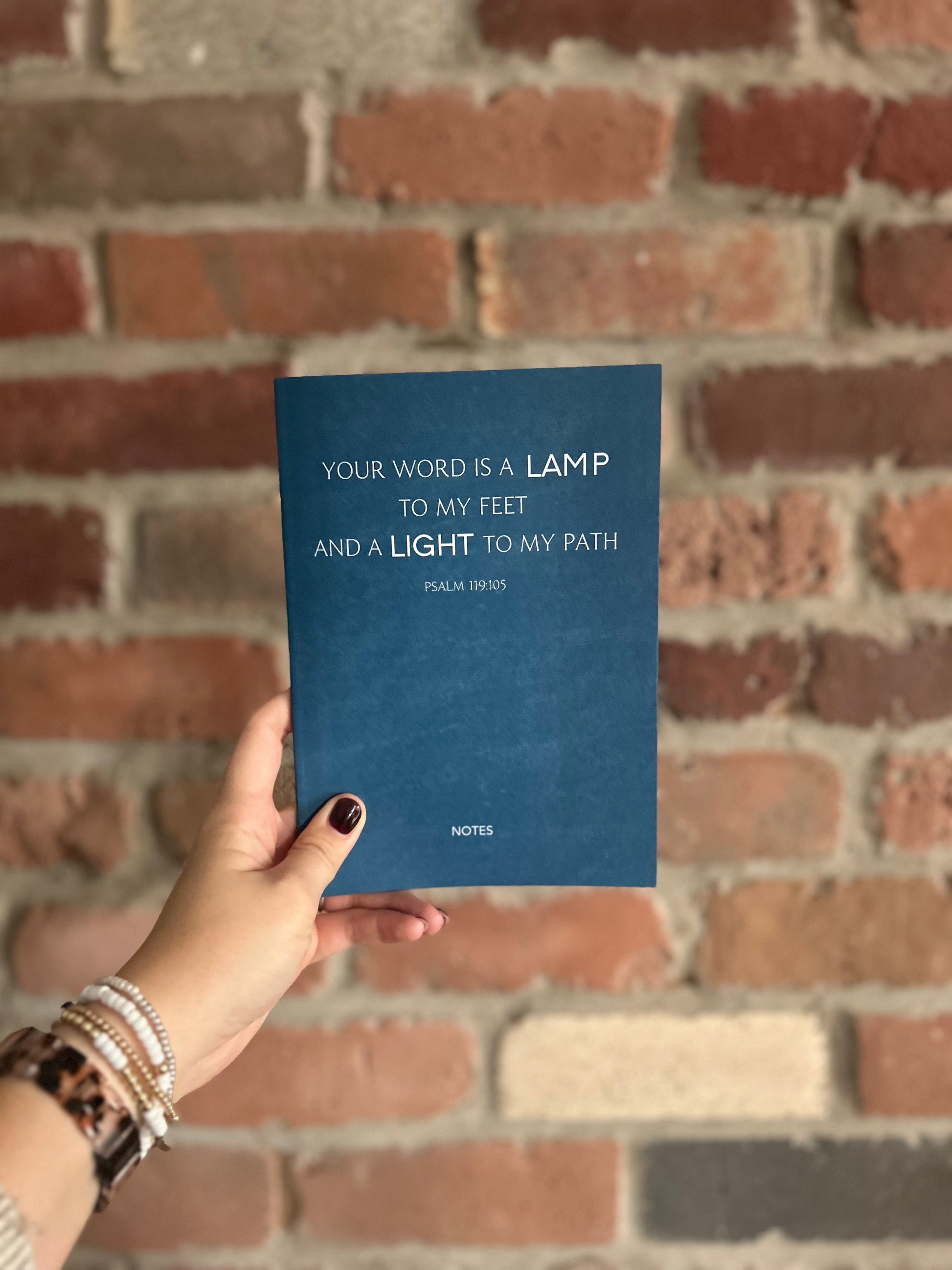 A 44 page A5 size simple textured design saddle stitched notebook with double sided 120gsm lined pages with margin. Bible verse cover of Psalm 119:105 Your word is a lamp to my feet and a light to my path (ESV).