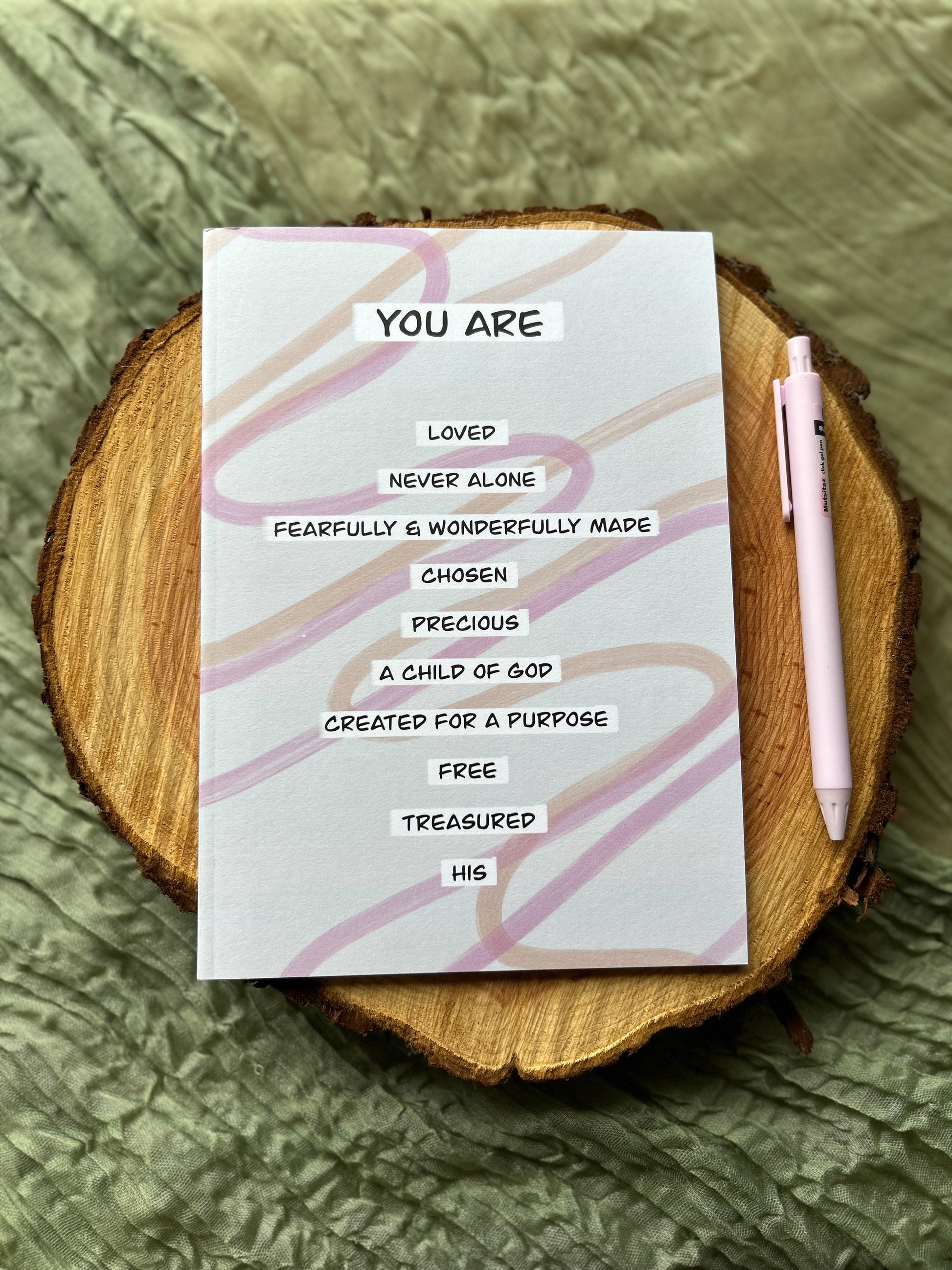 A 44 page A5 size simple abstract illustrations design saddle stitched notebook with double sided 120gsm lined pages. Encouraging cover that includes You are...statements such as You are loved , chosen, a child of God...