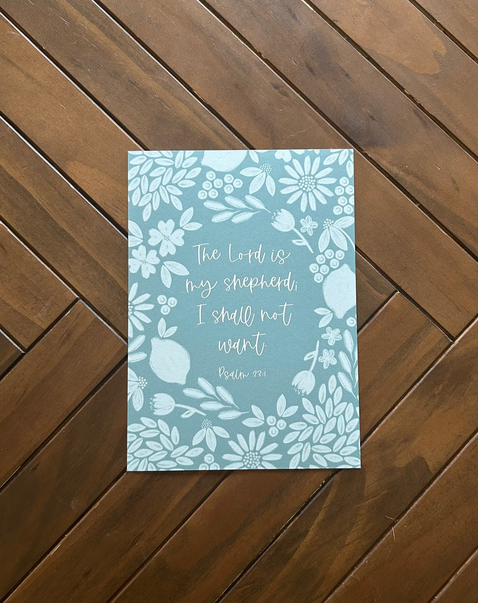TheLord is my shepherd; I shall not want. Psalm 23:1 - Bible verse print with floral and fruit illustrations on a light blue background.