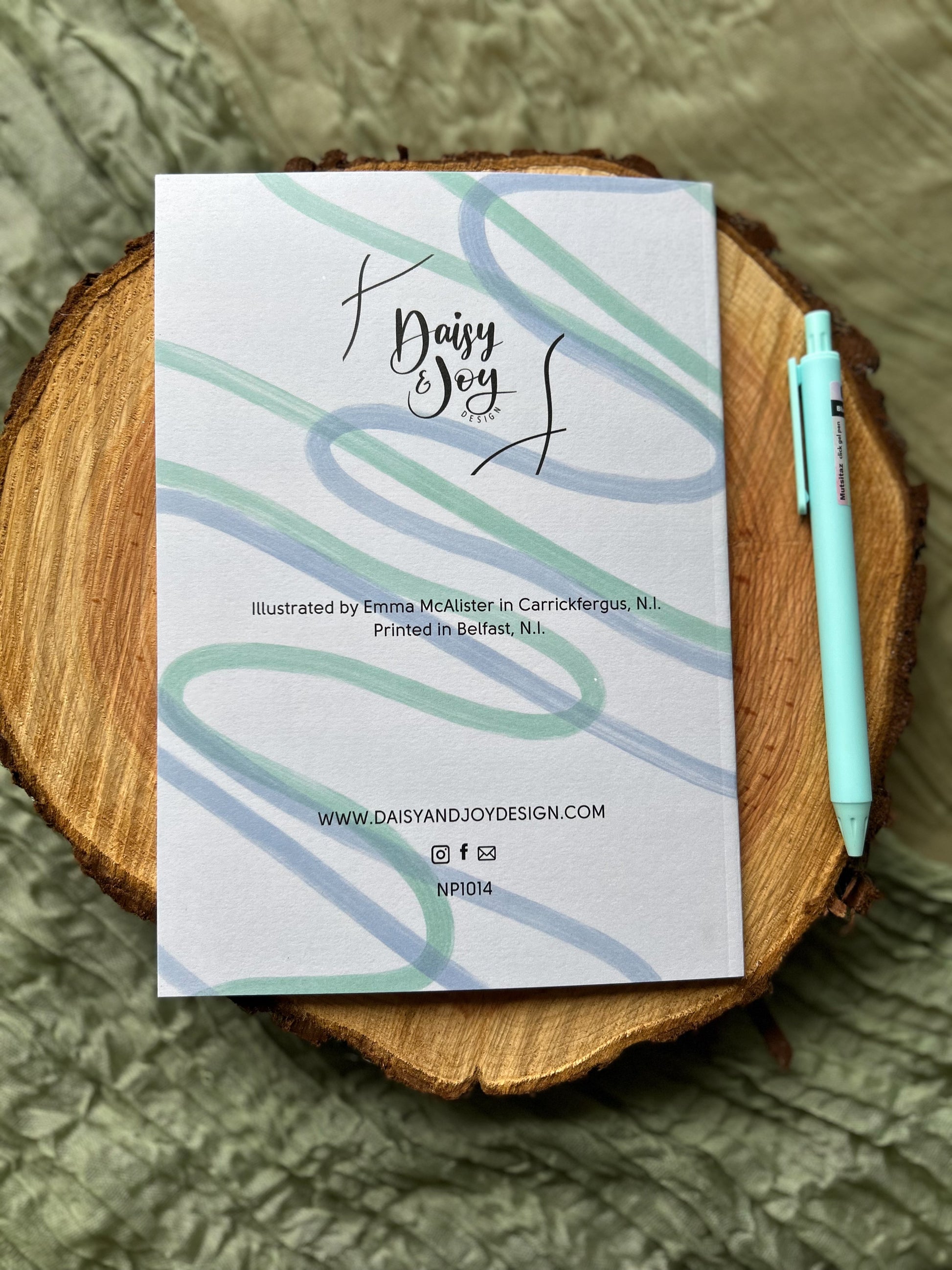A 44 page A5 size simple abstract illustrations design saddle stitched notebook with double sided 120gsm lined pages. Encouraging cover that includes You are...statements such as You are loved , chosen, a child of God...